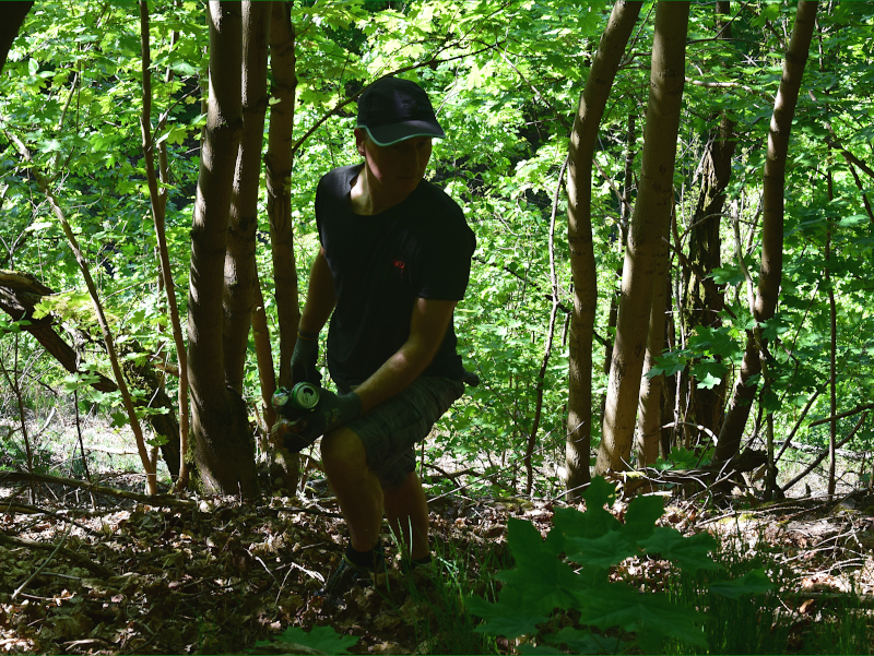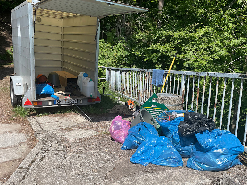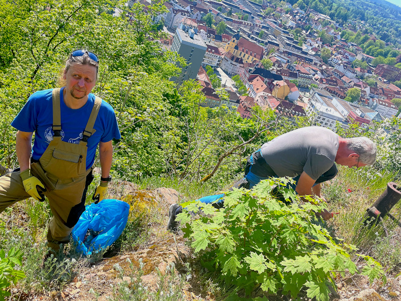 und Handschuhen, um den an den Hängen acht- und respektlos in der Natur entsorgten Unrat aufzuklauben.