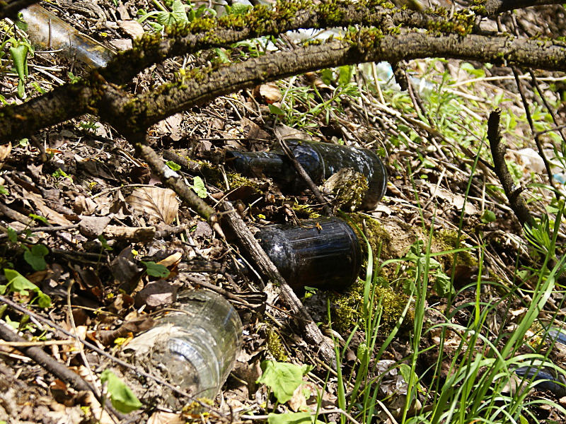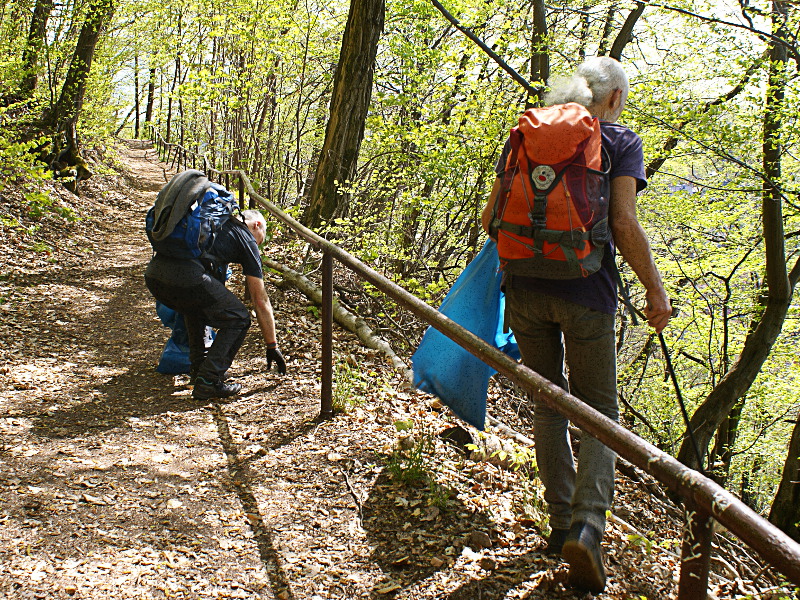und Handschuhen, um den an den Hängen acht- und respektlos in der Natur entsorgten Unrat aufzuklauben.